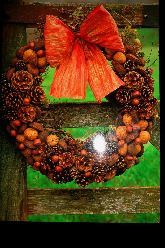 une très belle carte représentant une couronne avec des pommes de pins et un très gentil mot à l'intérieur ....