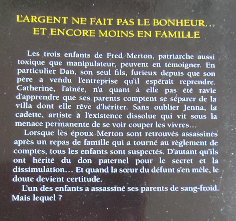 Ce n'est pas le genre de roman que je lis habituellement, mais c'est une amie qui m'a conseillé de le lire...je me suis lancée et j'ai beaucoup aimé ! C'est un thriller, mais qui ne fait pas frissonner, et qui n'empêche pas de dormir, lol! Je vais d'ailleurs essayer de trouver les autres romans de cet auteur !