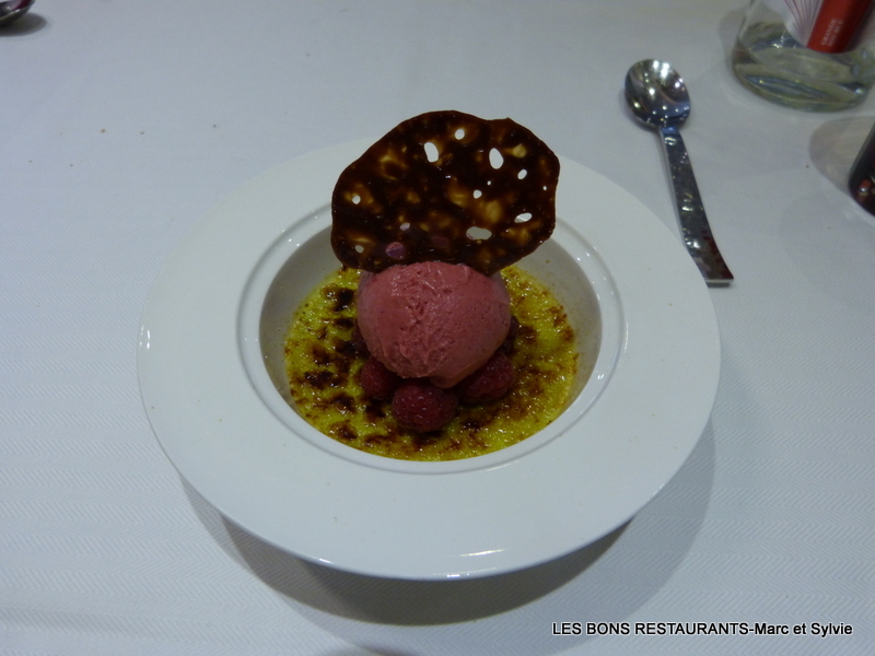 La crème brûlée à la pistache et aux framboises a eu beaucoup de succès.