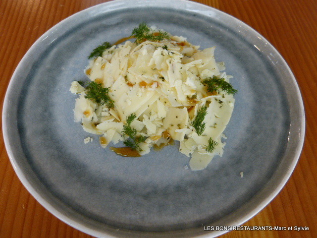 Enfin, le plat principal se compose d'un morceau de coq aux asperges sauvages, navet, ail , pommes de terre fumées et laurier.