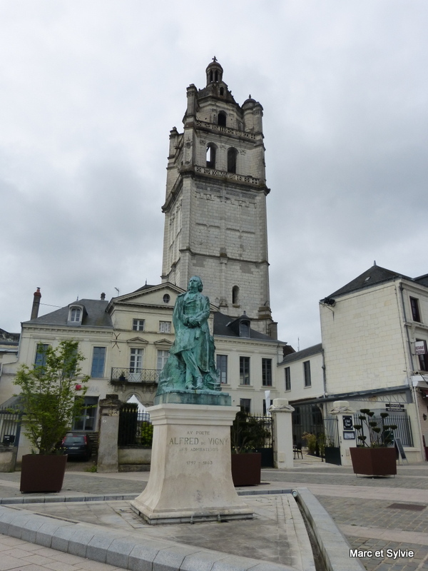 Place du marché aux fleurs avec la tour Saint-Antoine et une statue du poète Alfred de Vigny.
