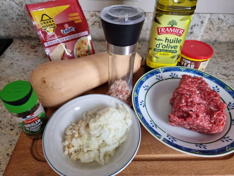 (4 personnes - préparation 15 minutes - cuisson 1h) -1 courge butternut -500g de chair à saucisse -oignon, ail, échalote -50g de parmesan -huile d'olive -sel, 4 épices