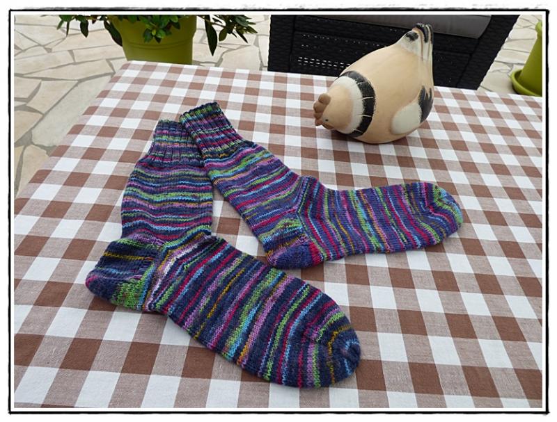 Jacqueline m'a tricoté une paire de chaussettes pour avoir bien chaud le soir devant la télé! J'aime beaucoup la laine chinée qu'elle a choisie. Ce mélange de couleurs est très harmonieux. Elles me vont parfaitement et sont bien douces.
