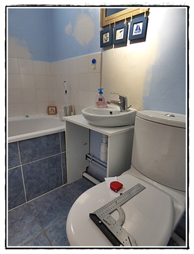 Cette année, comme nous allons recevoir de la visite, nous nous sommes dits qu'il serait certainement plus pratique qu'elle soit aussi opérationnelle. Donc, mon "bricoleur préféré" s'est lancé.... Pour commencer, il a habillé le dessous du petit lavabo, avec un meuble fait sur mesure. J'avais envie que les conduites soient cachées. Roger a ensuite ajouté une tablette à l'intérieur, cela me permet de ranger des "trucs"!