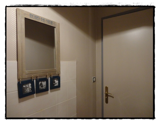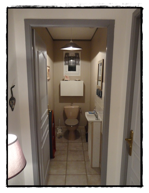 Les toilettes, c'est comme le couloir.... vous allez voir le changement.... A l'origine, les murs étaient peints en jaune orangé et avaient été décorés par des pochoirs d'éléphants gris.....