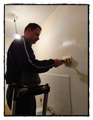 Roger repeint les murs en blanc puis les tapisse avec de la toile de verre qui nous reste. Nous avons choisi nos couleurs : les tons beige et gris.