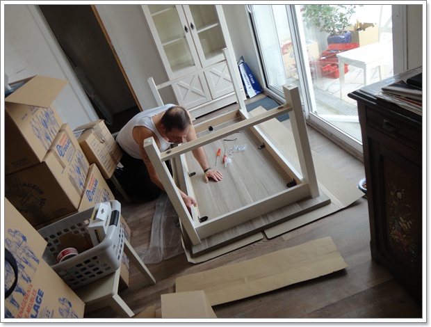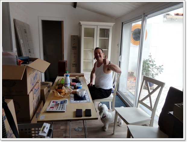 Ce premier petit-déjeuner dans notre nouvelle maison fera partie des souvenirs inoubliables..... car notre nouvelle table de salle-à-manger était encore emballée et il fallait la monter.....