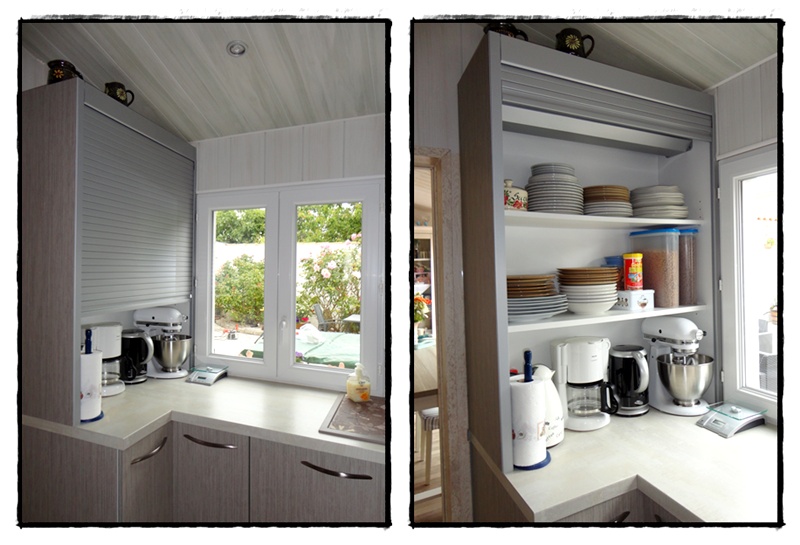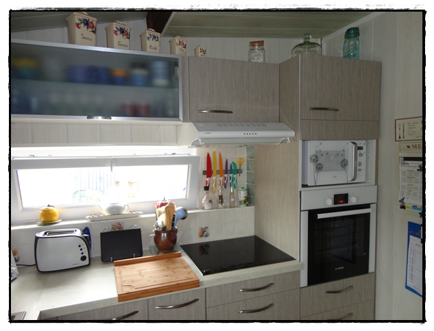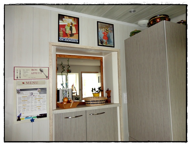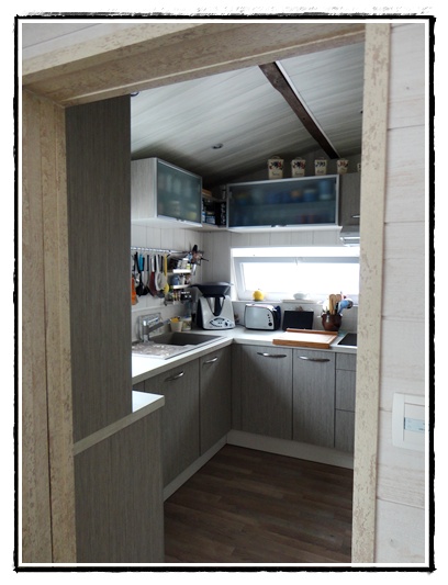 Je suis contente de vous retrouver après une période bien occupée et un peu fatiguante.... entre les travaux dans la maison, le rangement, le nettoyage, de nombreux commentaires que j'avais tardé à valider.... une petite "faiblesse" du côté de Certiferme qui fut résolue au cours de ce WE..... et de gros orages qui nous ont privés d'internet..... Bref! me revoilà et je vais tenter de retrouver mon rythme habituel de publication. Je dis bien "tenter".... Pour commencer, je vous présente ma nouvelle cuisine dont je vous ai déjà parlé et qui est opérationnelle à présent. Lorsque nous sommes dans la salle-à-manger, voilà la vue vers la cuisine. Elle n'est pas grande mais fonctionnelle. Je ne fais pas beaucoup de pas mais elle est bien conçue et surtout, je lui trouve un petit cachet particulier! Bon, vous avez compris qu'elle me plait.... Sur la gauche en entrant, je tenais à avoir un meuble rideau. J'en avais un à Meursac et j'avais trouvé cela très pratique. Dans le bas, sont installés mes appareils ménagers dont je me sers quasiment quotidiennement.