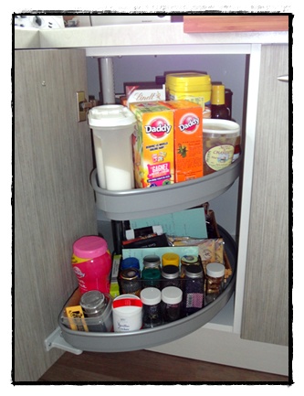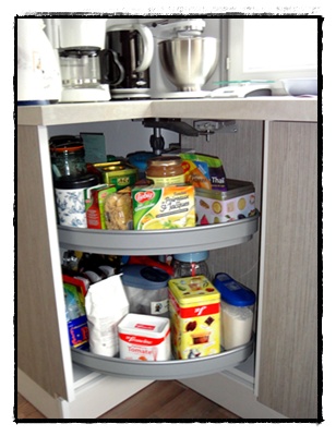 Les éléments bas se composent d'une huche à pain avec porte-bouteilles, d'un tiroir pour les couverts et de casseroliers. Dans l'angle, j'ai encore des plateaux tournants mais différents des précédents car ils ne tournent qu'à 90°.