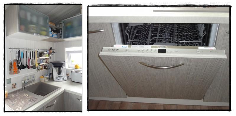 Le coin évier avec le lave-vaisselle intégré et le bandeau de commande à l'intérieur. Au-dessus de l'évier, nous avons installé une barre qui permet de cacher des trous faits par les anciens proprios. Les éléments ont des portes vitrées qui se lévent pour s'ouvrir.