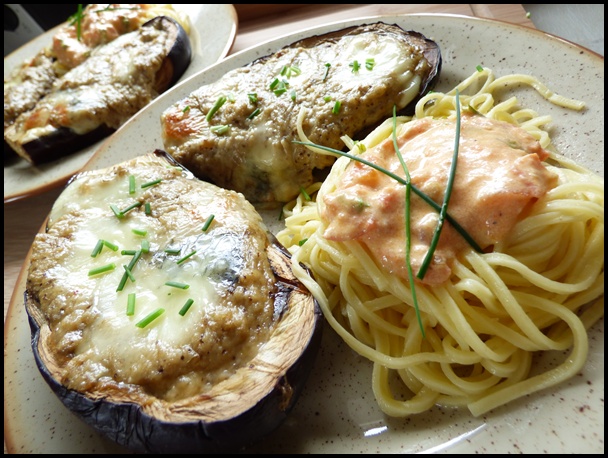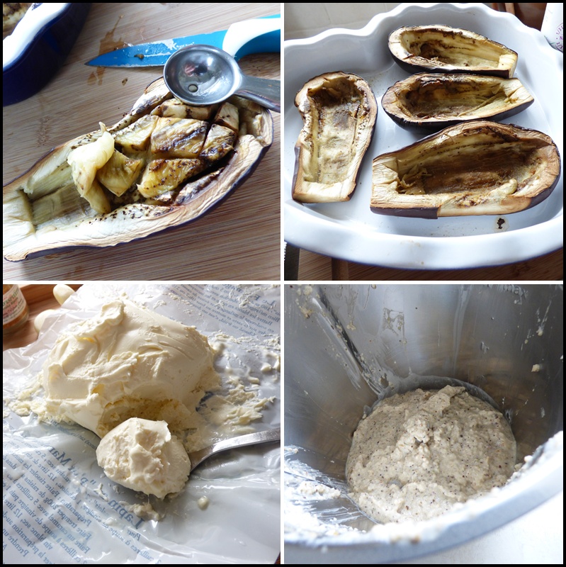 Une façon originale de farcir des aubergines!  Les ingrédients : - 2 aubergines - 2 oignons - 1 gousse d'ail - 150g de morbier - 15g de beurre demi-sel - 4 cuillères à soupe de "Petit Manslois" ou 4 petits suisses - huile d'olive - sel et poivre du moulin - thym - piment d'Espelette   La recette : 1 - Préchauffer le four à 180°. Laver et couper les aubergines en deux dans le sens de la longueur. 2 - Les disposer dans un plat. Les arroser d'un filet d'huile d'olive et faire quelques entailles dans la chair pour que l'huile pénètre bien. 3 - Les faire cuire pendant 30 minutes. 4 - Eplucher les oignons et couper le morbier en petits morceaux. 5 - Mettre les oignons coupés en 2 dans le bol du thermomix. Mixer 5 secondes, vitesse 5. 6 - A l'arrêt de la minuterie, racler les bords avec une spatule. Ajouter le beurre et faire revenir les oignons hachés pendant 5 minutes, vitesse 2, température Varoma.   7 - Evider les aubergines en faisant attention de ne pas percer la peau. Garder la chair. 8 - Dans le bol, ajouter le petit Manslois ou des petits suisses, la chair des aubergines, la gousse d'ail, les 3/4 du morbier. Saupoudrer de piment d'Espelette, de thym. Saler et poivrer. Mixer 15 secondes, vitesse 6.   9 - Farcir les aubergines avec cette préparation et parsemer le reste du morbier sur le dessus.  10 - Enfourner pendant 15 minutes pour faire fondre le fromage. 11 - Servir bien chaud. J'avais un reste de pâtes et de sauce tomate qui ont complété mon assiette.  Bon appétit! C'est un délice.... Mon conseil : Vous découvrirez ICI des infos sur le petit Manslois. Bonne lecture! |