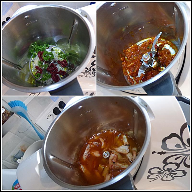 | J'ai souvent réalisé cette recette aux saveurs exotiques mais c'est une première de la préparer au thermomix. Voici ma recette : Les ingrédients : - 400g de crevettes - quelques bâtonnets de surimi (pas obligatoire) - 1 oignon - 1 gousse d'ail - 1 petite boîte de lait de coco - quelques pincées de gingembre en poudre ou 10g de gingembre frais - 2 cuillères à soupe de concentré de tomate - 1/2 cuillère à café de curcuma en poudre - 1 cuillère à soupe de sauce soja - 1 cuillère à café de curry en poudre - 3 tranches d'ananas - Huile d'olive - sel et poivre du moulin - du riz en accompagnement La recette : 1 - Décortiquer les crevettes et mettre de côté dans un saladier, les têtes et les queues. Elles nous serviront ensuite à préparer une bisque de crevettes. Rien ne se perd! La recette est ICI. 2 - Eplucher l'oignon, le couper en deux et le mettre dans le bol avec l'ail, le gingembre, le curcuma et le curry. Mixer 5 secondes, vitesse 5. 2 - Ajouter l'huile et faire revenir 5 minutes, 90°, vitesse mijotage, sens inverse. 3 - Ajouter le concentré de tomate, la sauce soja, le lait de coco, un peu de sel. Mélanger 3 secondes, vitesse 3. 4 - Ajouter les crevettes, les bâtonnets de surimi coupés et les morceaux d'ananas. Mélanger et laisser mariner 30 minutes à froid.   5 - Commencer la cuisson du riz.  6 - Une fois les crevettes bien marinées, faire mijoter 10 minutes, 90°, sens inverse, vitesse mijotage. 7 - Rectifier l'assaisonnement. Egoutter le riz et préparer de belles assiettes. Pour la recette sans Thermomix, je vous invite à suivre ce lien.   |