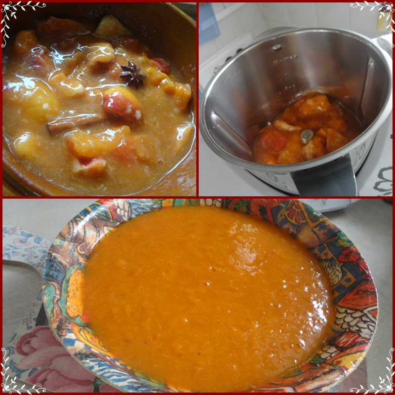 Après avoir fait la gelée de coings, j'ai utilisé une partie des fruits cuits que j'avais mis de côté pour préparer de la compote.  Les ingrédients : - 500g de coings cuits non épluchés sans le coeur et les pépins - 120g de cassonade (à ajuster) - 30g d'eau Pour parfumer la compote, vous pouvez ajouter 1/2 cuillère à café d'épices pour pain d'épices ou aussi des pommes. La recette : 1 - Mettre les coings coupés en morceaux et épépinés dans le bol du Thermomix. Mixer 5 secondes, vitesse 5. 2 - Faire cuire 20 minutes, vitesse 2, 100°. Placer le panier de cuisson sur le couvercle pour éviter les éclaboussures.   3 - Si vous aimez la compote fine, à la sonnerie, mixer 40 secondes progressivement jusqu'à la vitesse 8. Le résultat gustatif est au rendez-vous. Une compote aux saveurs de Noël! Vous pouvez aussi vous servir de cette compote pour garnir un fond de tarte aux pommes.   |