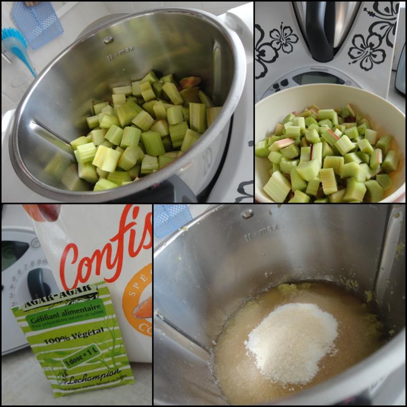 Encore une promo chez mon marchand de fruits et légumes... 5€, le cageot de rhubarbe. Il a fait mon affaire!   Les ingrédients : - 600g de fruits épluchés - 300g de sucre - 1/2 cuillère à café d'agar-agar La recette : 1 - Eplucher les bâtons de rhubarbe et les couper en morceaux. 2 - Mettre la rhubarbe dans le bol et mixer 20 secondes, vitesse 6. 3 - Ajouter le sucre et l'agar-agar. 4 - Cuire 10 minutes, sens inverse, vitesse 2.   5 - A l'arrêt de la minuterie, verser la confiture dans des pots que vous avez pris la précaution d'ébouillanter.   Recettes de confiture de rhubarbe sans thermomix : - Rhubarbe et pommes - Rhubarbe et bananes - Rhubarbe, pommes et noix   |