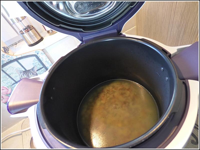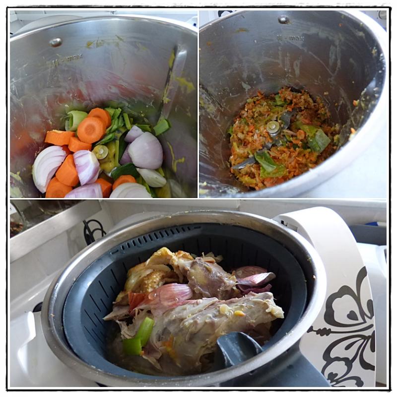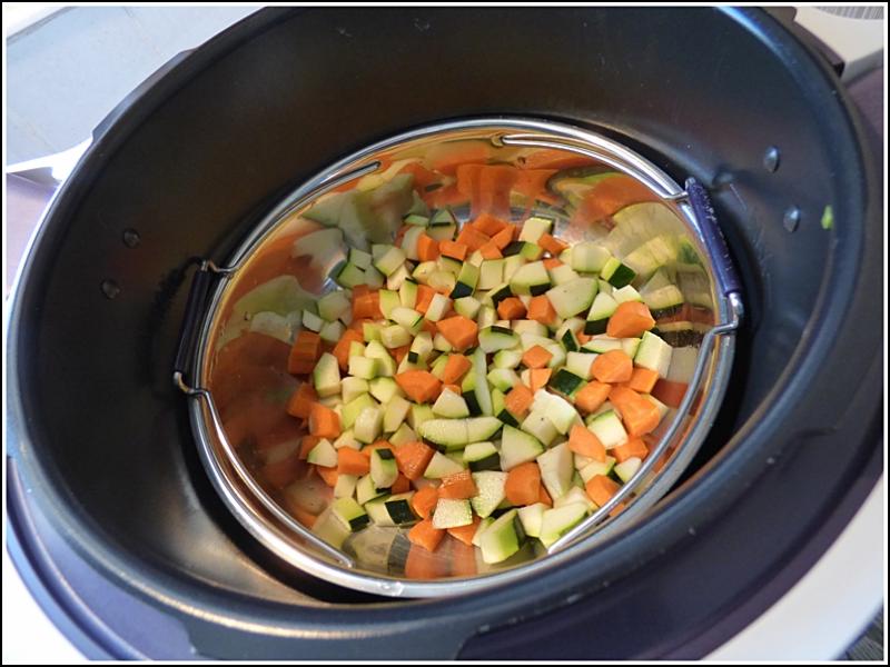 | Voilà comment rentabiliser au maximum son Thermomix..... Dans le bol, vous cuirez les légumes pour la soupe, dans le panier de cuisson, vous cuirez le riz et au dernier étage, dans le Varoma, vous cuirez les tagliatelles de courgettes et carottes. Quant aux cordons bleus, je les ai cuits tout simplement à la poêle. Les ingrédients : - 2 cordons bleus - 1 oignon - 1 gousse d'ail - 2 carottes - 2 courgettes - 20g d'huile d'olive - 400g d'eau - sel et poivre du moulin - pour le velouté : environ 450g de légumes de votre choix (carottes, pommes de terre, poireaux, ....) - pour la sauce : 50g de crème fraîche, 1 cuillère à soupe de moutarde, sel et poivre du moulin, 1 jaune d'oeuf La recette : 1 - Mettre l'oignon et la gousse d'ail dans le bol. Hacher 5 secondes, vitesse 5. Racler les bords avec une spatule. 2 - A l'aide d'un économe, détailler les carottes, les courgettes en tagliatelles et les déposer dans le Varoma. Arrêtez-vous à la zone du coeur des carottes et des courgettes. Saler et poivrer.   3 - Mettre le coeur des carottes et des courgettes coupées en morceaux, dans le bol. Ajouter l'huile d'olive et programmer 1minute 30, 80°, vitesse 1. Ne pas mettre le gobelet doseur.  4 - Ajouter l'eau dans le bol et d'autres légumes si vous en avez envie. 5 - Mettre le riz dans le panier cuisson, le rincer sous l'eau et le mettre en place dans le bol. 6 - Fermer avec le couvercle et poser le Varoma qui contient les tagliatelles de légumes. Programmer 20 minutres, température Varoma, vitesse 1.   7 - Pendant la cuisson, faire cuire les cordons bleus dans une poêle. A la fin de la cuisson du Thermomix, vérifier si tout est bien cuit. Réserver le Varoma.  8 - En fonction de la consistance du velouté que vous aimez, ajouter éventuellement de l'eau jusqu'à la graduation 1 litre ou 1,5 litre. Mixer 10 secondes, vitesse 5. 9 - Préparation de la sauce : garder un fond de velouté à la hauteur des couteaux du bol. Placer le reste du velouté dans un récipient et réserver.  10 - Ajouter la crème fraîche, la moutarde, le sel et le poivre, le jaune d'oeuf. Mixer 20 secondes, vitesse 7 puis chauffer 2 minutes, vitesse 2. 11 - Je garde le velouté pour le soir et je sers le reste pour le repas de midi. Pour d'autres recettes Thermomix, suivez ce LIEN. J'ai réalisé cette recette avec mon anicier Thermomix le TM31.   |