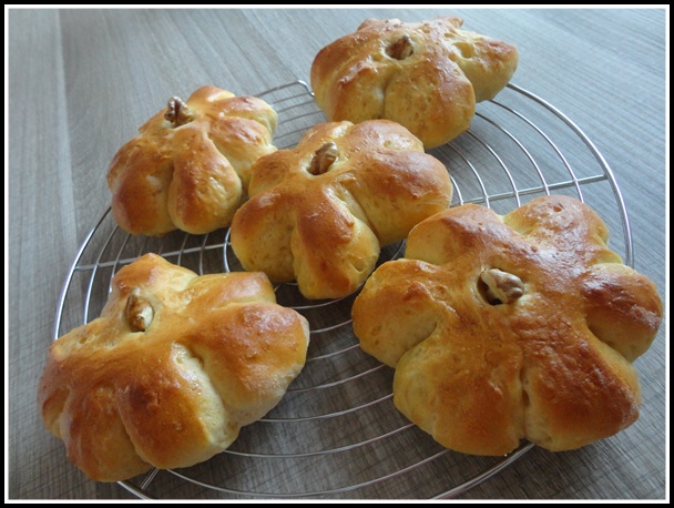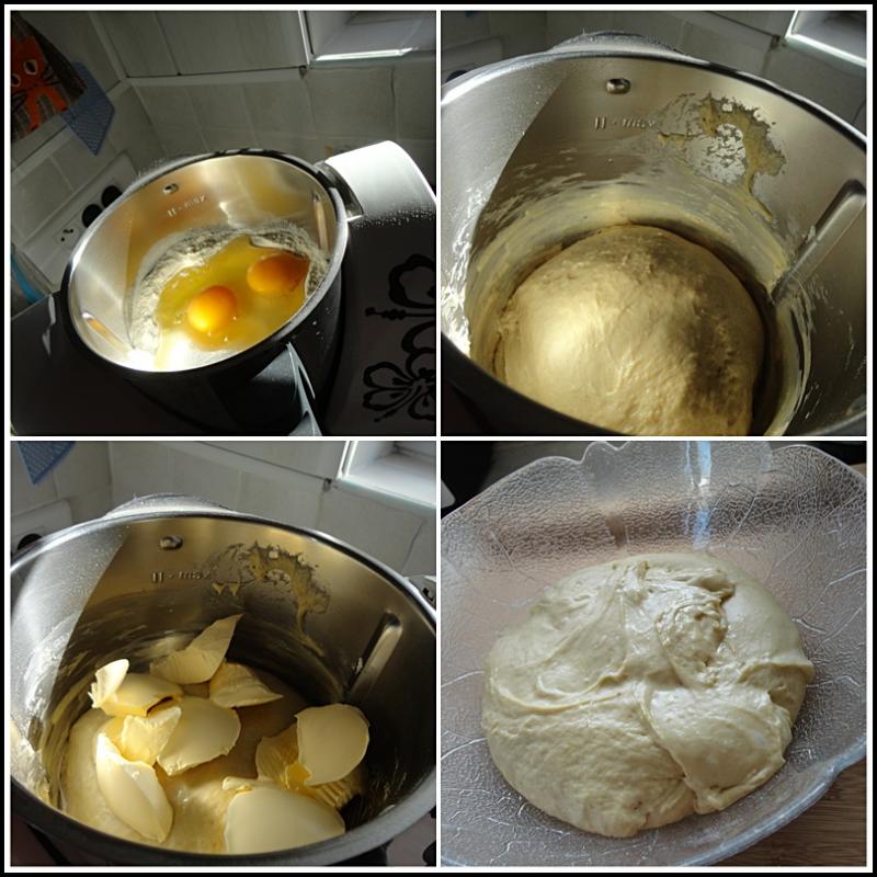 Cette brioche est une référence sur le net. C'est mon amie Martine qui m'en a parlé et qui nous l'a fait goûter. Une pure merveille, un nuage de légéreté!!!! Elle est simple de réalisation et vous pouvez la réaliser avec n'importe quel robot pétrisseur. Les ingrédients : - 500g de farine T45 - 70g de sucre glace - 90g de beurre en pommade - 120g de lait - 3 oeufs - 1 pincée de sel fin - 1 sachet de levure sèche (14g) ou 1 paquet de levure fraîche (20g) - sucre en grains pour le décor (ou pépites de chocolat, fruits confits, ...).   La recette : 1 - Dans le bol du thermomix, mettre le lait, les oeufs et le sucre glace. Programmer 2 minutes, 37°, vitesse 2. 2 - Ajouter par le trou du couvercle, la levure et la farine et programmer 4 minutes, fonction épi. Pour la farine, j'ai fait un petit mélange : 400g de farine T45 et 100g de farine de châtaignes, figues et noisettes. 3 - Toujours par le trou du couvercle, ajouter le beurre et le sel. Programmer 5 minutes, fonction épi.   4 - Poser le gobelet sur le couvercle du bol. Laisser lever la pâte jusqu'à ce que le gobelet se soulève et se renverse comme sur la photo! 5 - Sortir la pâte du bol. La verser dans un saladier ou sur un plan de travail fariné.   6 - Sur une plaque allant au four, déposer une feuille de cuisson ou du papier sulfurisé. Poser un cercle métallique réglé sur un diamètre de 26 centimètres.  7 - Diviser la pâte et former des boules d'environ 80g. Les déposer sur le pourtour intérieur du cercle et les dernières dans le milieu.   8 - A l'aide d'un pinceau, humidifier le dessus des boules et déposer le décor de votre choix (sucre en grains, pépites de chocolat, fruits confits, ...). 9 - Placer au four pour préchauffé à 50° pour une seconde levée pendant 20 minutes. 10 - Placer un ramequin d'eau dans le four préchauffé à 180°. Faire cuire la brioche pendant 20 à 25 minutes selon votre four.    Et voilà! Lorsque j'ai enlevé mon cercle de pâtisserie, j'étais déçue car le tour de la brioche n'avait pas bien doré. Et pourtant la brioche était cuite. Je pense qu'il devait être un peu trop épais! Donc moralité.... la prochaine fois, je n'utiliserai plus ce cercle pour faire cuire la brioche. Je pense refaire un test ces jours-ci! Le test est refait. C'est ICI. La recette sans thermomix : 1 - Dans un saladier, délayer la levure dans le lait tiède. Couvrir et laisser le mélange doubler de volume et devenir mousseux pendant 10 minutes environ. 2 - Dans le bol du robot, verser la farine, le sucre glace, la pincée de sel. Mélanger à l'aide du crochet. 3 - Ajouter le beurre en pommade, les oeufs et le mélange levure/lait tiède. Mélanger jusqu'à ce que la pâte se décolle du bol. 4 - Couvrir et laisser lever la pâte à l'abri des courants pendant 1 heure. 5 - Dégazer la pâte. Diviser le pâton en petites boules. Les placer dans un moule à manqué (par exemple). 6 - Placer au four pour préchauffé à 50° pour une seconde levée pendant 20 minutes. 7 - Préchauffer le four à 180° (Th 6). 8 - Badigeonner la brioche d'eau et la parsemer de grains de sucre perlé. 9 - Enfourner 20 minutes et laisser refroidir sur une grille.   |