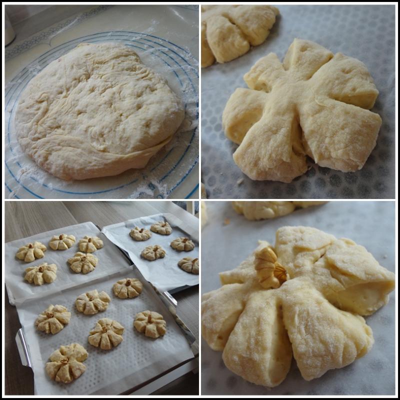 Si vous avez un peu de temps devant vous et si vous voulez vous amuser... alors préparez cette brioche très rigolote! Je suis sûre qu'elle plaira autant aux petits qu'aux grands. Les ingrédients : - 500g de farine - 1 oeuf - 220g de lait - 1 cuillère à café de sel - 20g de levure fraîche - 60g de sucre - 70g de beurre - quelques cuillères de confiture, nutella ou caramel chocolat au beurre salé Pour la décoration : - 2 cure-dents - 2 raisins secs ou pépites de chocolat La recette : 1 - Dans le bol du thermomix, mettre le lait et la levure. Régler 2 minutes, 37°, vitesse 1. 2 - Ajouter la farine (j'ai mis 400g de farine T45 et 100g de farine à l'amarante), le sucre, le sel et l'oeuf. Programmer 3 minutes, bol, fonction épi. 3 - Ajouter le beurre coupé en morceaux. Régler 8 minutes, bol, fonction épi. 4 - Sortir la pâte du bol. La mettre dans un saladier et le couvrir d'un torchon. 5 - Laisser lever 1h30. La pâte doit doubler de volume.   Préparation de la chenille.... 6 - Fariner votre plan de travail ou travailler sur une feuille de pâtisserie farinée. J'ai encore ma "vieille" feuille Tupperware très pratique! 7 - Etaler la pâte en un grand rectangle. Sur la partie basse de la pâte, étaler de la confiture, du nutella, .... Moi, j'ai mis du caramel chocolat au beurre salé. Attention à ne pas en mettre trop près des bords. 8 - Dans la partie haute, découper des lanières.   9 - Rouler la pâte en boudin en commençant par le bas du rectangle (partie tartinée). 10 - En arrivant au niveau des lanières, les rabattre une à une sur le boudin garni. Pour plus de facilité, j'ai coupé les lanières toute à la même longueur et j'ai mis le restant de pâte de côté. 11 - Déposer 2 pépites de chocolat ou deux petits morceaux de raisins secs au bout de la brioche pour former les yeux. Avec les chutes de pâte, j'ai confectionné 2 antennes. Pour les faire tenir, j'ai utilisé un morceau de cure-dents que j'ai habillé avec la pâte.   12 - Pour terminer d'utiliser la pâte, j'ai fait une petite chenille sur le même principe. 13 - Laisser lever à nouveau 1 heure. Préchauffer le four à 180°. Badigeonner d'un jaune d'oeuf dilué dans un peu d'eau ou de lait.   14 - Enfourner et cuire une vingtaine de minutes.  Dommage j'ai eu une petite fuite de chocolat.... Cela n'a pas empêché la bébête de vite se retrouver en morceaux.....  Vous pouvez réaliser la pâte à brioche avec une machine à pain ou un robot. Christine du blog "Simple chez Christine" avait aussi réalisé cette chenille briochée.    |