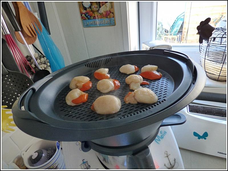 Aujourd'hui, j'ai eu la visite de Magaly, conseillère Thermomix. Elle est venue me voir pour faire un point et répondre à mes questions puisque maintenant j'utilise souvent mon Thermomix. Cette visite est prévue dans le contrat lorsque vous achetez cet appareil. Je m'étais préparé une petite liste de questions et nous avons discuté un bon moment ensemble. Un livre m'avait été livré avec l'appareil "A table avec Thermomix" et aujourd'hui, j'ai reçu un second livre "Ma cuisine 100 façons".  Encore de nouvelles recettes à découvrir. Ce midi, j'ai préparé des noix de saint-Jacques aux poireaux. C'était délicieux....   |