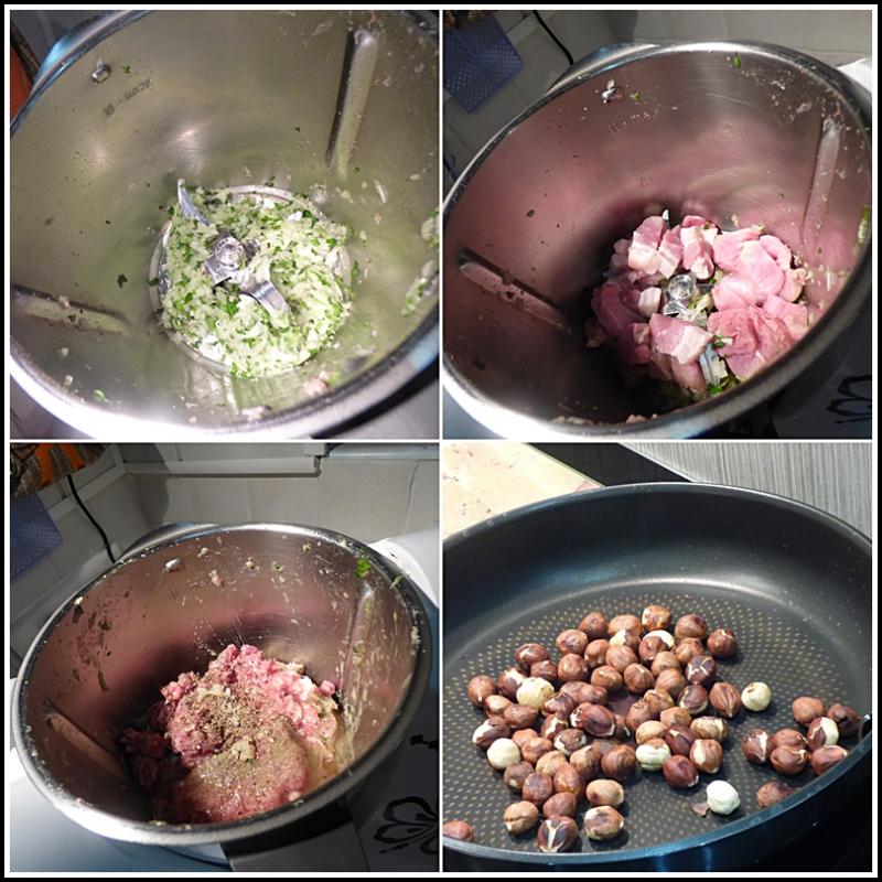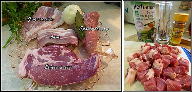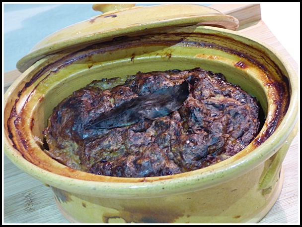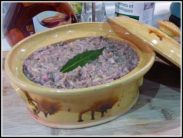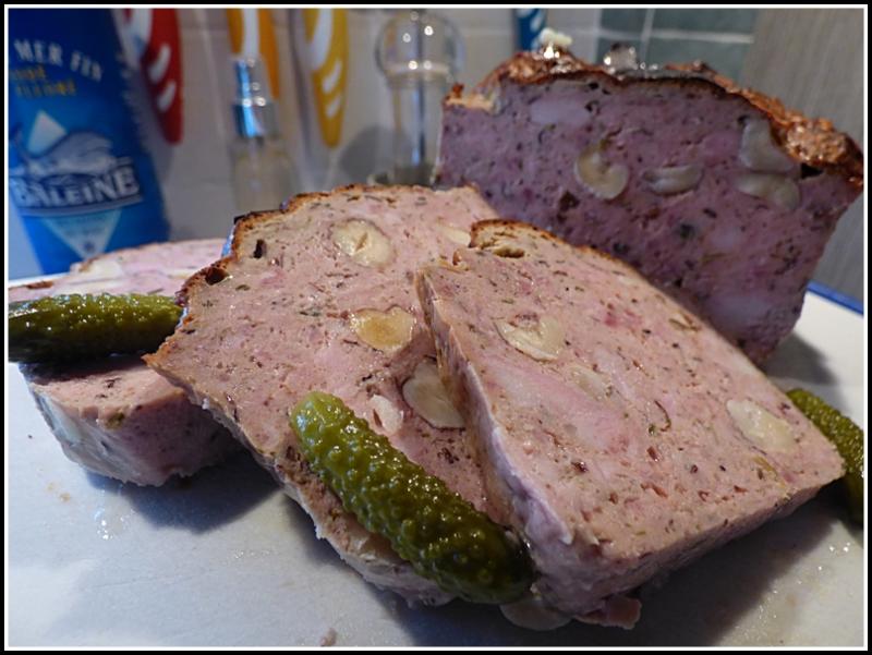 Depuis le temps que je voulais tester cette recette trouvée sur le livre "A table avec Thermomix".... Voilà, c'est fait et nous avons apprécié.  Les ingrédients : - 250g d'échine de porc - 100g d'épaule de veau - 100g de gorge de porc - 1 tranche de lard - sel et poivre du moulin - 1 cuillère à café de 4 épices - 60g d'oignon - 4 branches de persil - 2 oeufs - 2 cuillères à soupe d'Armagnac ou Cognac - 60g de noisettes décortiquées - 1 feuille de laurier La recette : 1 - Préchauffer le four à 180°. 2 - Couper chacune des viandes en morceaux de 2 centimètres.   3 - Dans le bol, mettre l'échine de porc, le sel, le poivre et les quatre épices. Mixer 5 secondes, vitesse 9. Réserver dans un saladier. 4 - Mettre l'oignon épluché et coupé en deux, le persil dans le bol et mixer 5 secondes, vitesse 6. 5 - Ajouter le lard et le veau et mixer 10 secondes, vitesse 6. 6 - Ajouter l'échine de porc réservée, les oeufs et l'Armagnac. Mixer 10 secondes, vitesse 4. 7 - Rectifier l'assaisonnement. Il doit être relevé. 8 - Faire légèrement griller les noisettes à sec dans une poêle anti-adhésive. Puis les ajouter dans le bol à la farce. Mixer sens inverse, cuillère, 5 secondes.   9 - A cette étape, il fallait tapisser la terrine avec une barde de lard. Je ne l'ai pas fait, mon boucher ayant oublié cet ingrédient dans ma commande.... 10 - Remplir la terrine de farce. Déposer une feuille de laurier sur le dessus. Rabattre la barde. Fermer la terrine. 11 -  Cuire la terrine au four au bain-marie 1 heure 30 à 180°. 12 - Laisser refroidir et mettre au réfrigérateur pendant 24 heures au moins avant de servir. Découper quelques tranches de pâté et les accompagner de petits cornichons.  ou bien préparer une jolie assiette. Accompagner le pâté de tranches de pain aux noix et au fromage.   Nous nous sommes régalés! J'ai oublié de vous préciser que cette recette peut être préparée avec un hachoir. Le thermomix n'est pas une nécessité....    |