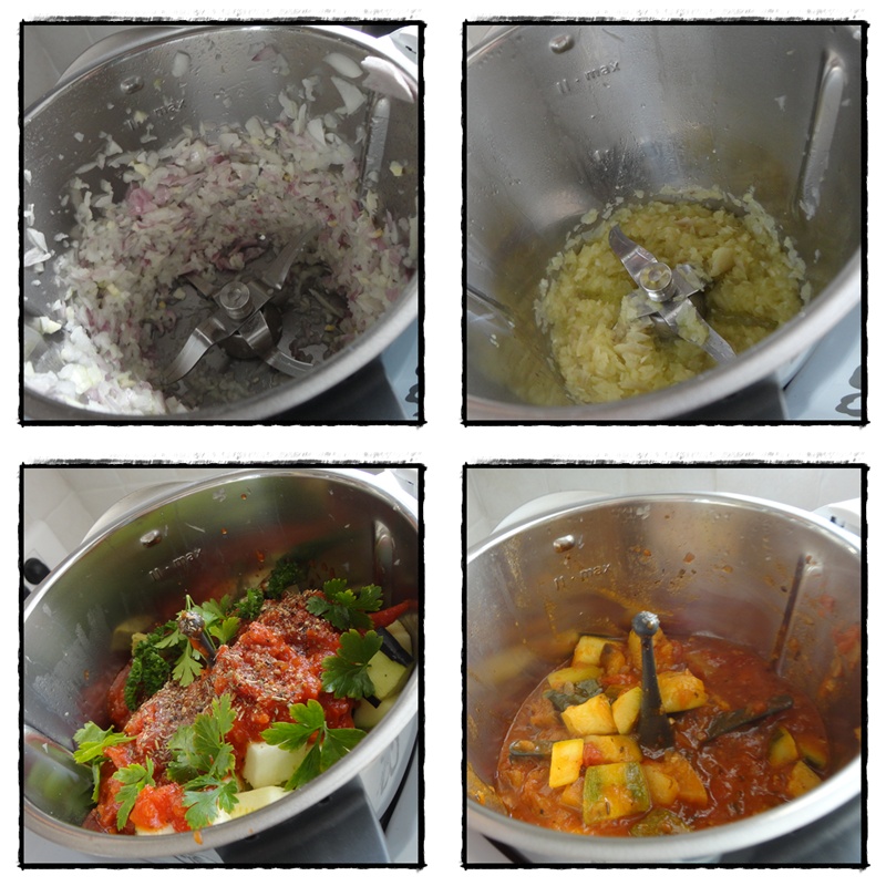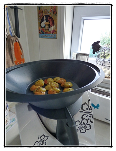 Hier, j'ai testé la recette de ratatouille présentée sur le livre de base du Thermomix. Habituellement, je mets aussi des poivrons mais tant pis pour cette fois, je l'ai préparée avec ce que j'avais dans mon bac à légumes....   Comme je n'ai pas voulu utiliser mes tomates fraîches, j'ai ouvert une boîte de chair de tomates au basilic et ça a fait l'affaire..... Les ingrédients : - 3 courgettes - 1 aubergine - 1 boîte de chair de tomates au basilic - 1 oignon - 1 échalote - 1 gousse d'ail - 1 bouquet de persil - des herbes de Provence - 20g d'huile d'olive - 1/2 cube Bouquet garni La recette : 1 - Dans le bol, mettre l'oignon coupé en 4, l'échalote, la gousse d'ail et mixer 5 secondes, vitesse 5. Racler les parois du bol à l'aide d'une spatule. 2 - Ajouter l'huile d'olive. Régler 5 minutes à 100°, fonction mijotage, fonction sens inverse. Cette dernière fonction permet de ne pas réduire en bouillie ce que vous avez mis dans le bol. C'est très utile et pratique. 3 - Pendant ce temps, préparer les légumes et les couper en morceaux. 4 - A l'arrêt de la minuterie, j'ai suivi le conseil Thermomix et j'ai inséré le fouet, ce qui permet de garder en morceaux tous les légumes. 5 - Puis ajouter tous les légumes, saler et poivrer. J'ai joué à "Madame Plus" en ajoutant 1/2 cube "bouquet garni". Régler 30 minutes à 100°, fonction mijotage, fonction sens inverse.   6 - J'ai accompagné cette ratatouille d'un cordon bleu et de quelques pommes de terre rôties. Nous nous sommes régalés. La ratatouille était délicieuse et je n'ai pas eu besoin de la surveiller. Je pousuis mes tests et ne suis pas déçue pour le moment.... Pour celles qui n'ont pas cet appareil, voici quelques recettes : - Ratatouille au chorizo - Ratatouille à ma façon   |