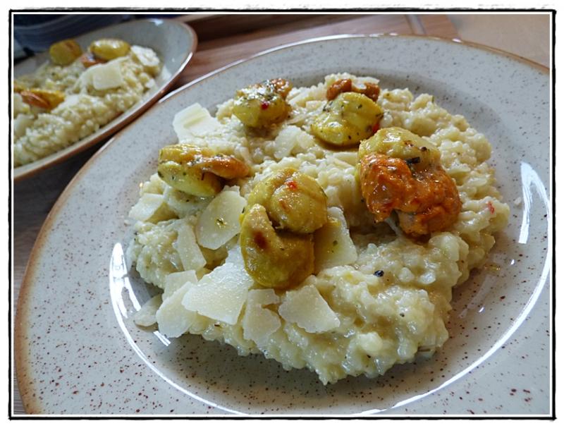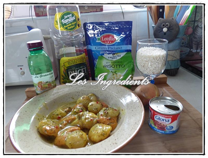 | J'avais profité, il y a déjà quelque temps, d'une promo chez Lidl de préparations de risotto à différents parfums...  Celui que j'ai choisi de cuisiner aujourd'hui est à base de purée de carottes, purée de tomates et noisettes hachées. J'ai ajouté à cette préparation des champignons de Paris et quelques noix. Les ingrédients : - 1 paquet de risotto (environ 180g) - 2 échalotes - 1 boîte de champignons de Paris - 16 cerneaux de noix - 100ml de vin blanc de cuisine - 400ml de bouillon de légumes - 2 ou 3 cuillères à soupe de crème fraîche - 2 cuillères à soupe de parmesan - huile d'olive - ciboulette - poivre La recette : 1 - Préchauffer le Cookéo en mode "Cuisson simple" puis "Dorer". Pendant le préchauffage, éplucher les échalotes, les émincer et les réserver. 2 - Faire revenir les échalotes dans la cuve du Cookéo avec un peu d'huile d'olive. 3 - Ajouter le riz, les champignons, les cerneaux de noix. Laisser dorer 3 minutes. 4 - Verser le vin blanc et le bouillon de légumes. Ne pas saler à cause du bouillon. 5 - Lancer une cuisson "sous pression" pour 15 minutes. 6 - A la fin de la cuisson, mélanger. Passer en mode "maintien au chaud" et ajouter la crème fraîche, le parmesan. Poivrer et mélanger à nouveau. 7 - Servir rapidement et parsemer le risotto de ciboulette hachée. Pour d'autres recettes réalisées au Cookéo, suivez ce LIEN.   |