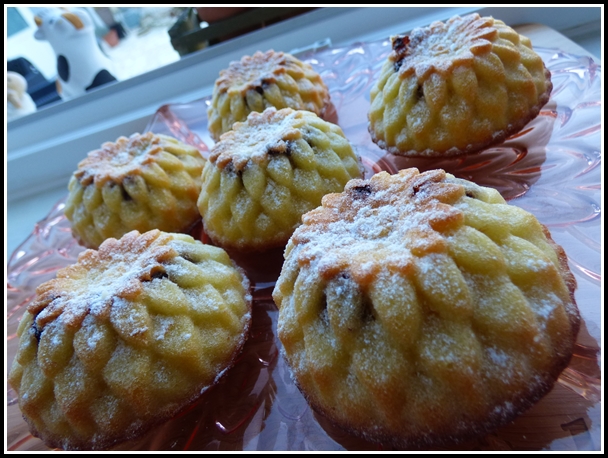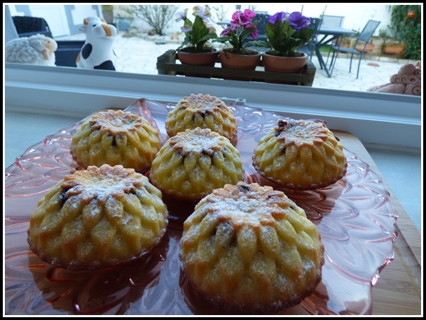 | Un petit clin d'oeil à Cat et à son article car elle a acheté le même moule que moi, en vente chez Lidl la semaine dernière. Inutile de vous dire que je l'ai tout de suite testé.... je n'avais pas encore eu le temps de vous le raconter et de partager avec vous cette recette de petits cakes très moelleux.  Quant à l'autre moule, je vous en parlerai dans un autre article. J'ai fait des petites choses pour l'apéro ou pour garnir une assiette de crudités. Les ingrédients : - 4 oeufs - 120g de beurre - 55g de lait - 120g de sucre - 250g de farine - 1/2 sachet de levure chimique - des pépites de chocolat - des amandes effilées La recette : Rien de plus simple.... 1 - Mettre dans le bol tous les ingrédients en respectant l'ordre indiqué dans les ingrédients. 2 - Mixer 1 minute, vitesse 7. 3 - Ajouter les pépites de chocolat et programmer quelques secondes, vitesse 3, sens inverse. 4 - Verser la pâte dans les différents compartiments du moule environ à mi-hauteur. 5 - Parsemer le dessus de la pâte avec des amandes effilées. 6 - Cuire au four préchauffé à 180° pendant une petite heure. Piquer la pâte pour vous assurer de la cuisson.  Petits gâteaux ultra rapides pour un résultat parfait : gonflés, moelleux et que l'on agrémente au gré des envies. Ces petits cakes furent très appréciés. Délicieux avec un nespresso!   |