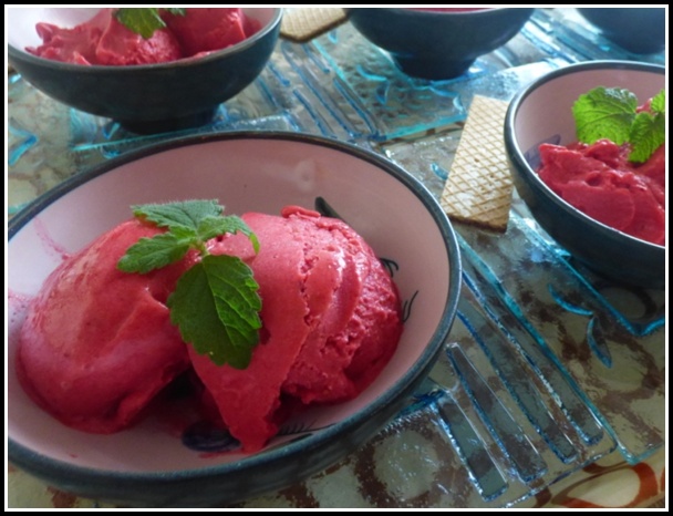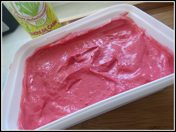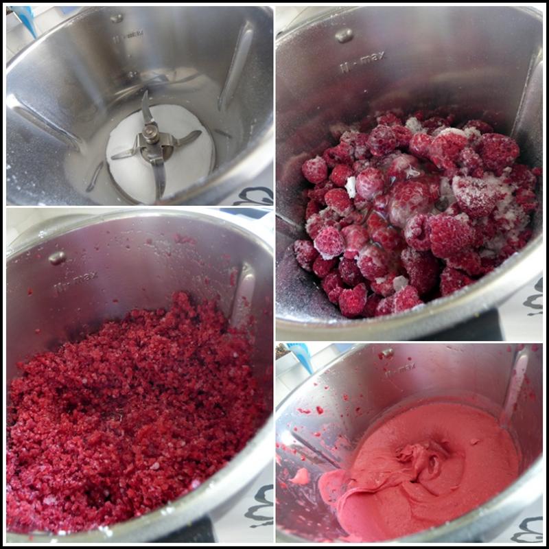 Nous avons bien apprécié ce bon goût de fruits. Rien à voir avec celui du commerce! Les ingrédients : - 500g de framboises congelées - 20g de sucre en morceaux ou de sucre fin - 1 blanc d'oeuf - 3 cuillères à soupe de sirop de sucre de canne La recette : 1 - Peser 20g de sucre dans le bol et le réduire en sucre glace en programmant 5 secondes, vitesse 9. 2 - Ajouter les framboises congelées, le blanc d'oeuf. Donner 6 pressions de turbo. 3 - Ajouter le sirop de sucre de canne. Mixer 2 minutes, vitesse 9 en vous aidant de la spatule afin d'avoir un mélange homogène.   4 - Vous pouvez le servir tout de suite ou bien le conserver au congélateur dans une boîte hermétique. Personnellement, je préfère le préparer à l'avance et le mettre au congélateur. Le sirop de sucre de canne empêche la formation de petits morceaux de glace dans le sorbet. C'est impeccable! 5 - Préparer vos coupes lorsque vos invités sont arrivés et décorer avec quelques feuilles de menthe.   Recette en sorbetière ou turbine : 1 - Remplacer le sucre par du sucre glace. Ne pas congeler les framboises. 2 - Dans le bol du mixeur, mettre tous les ingrédients et mixer soigneusement. 3 - Verser dans la sorbetière ou la turbine et programmer 30 minutes. 4 - Servir immédiatement ou conserver au congélateur.   |