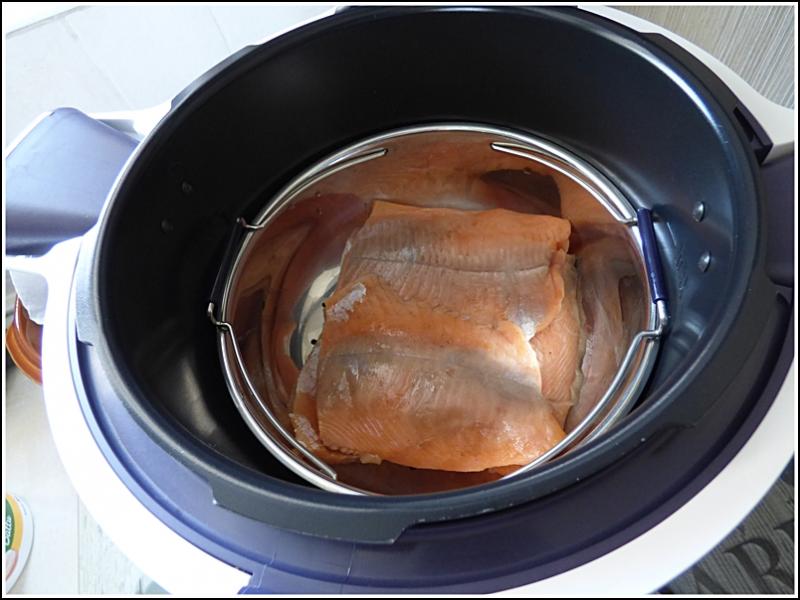 | Je me suis inspirée de la recette trouvée sur le site "La cuisine de Boomy" pour réaliser ce plat qui est à l'origine cuit au four. J'ai adapté cette belle recette pour la réaliser au cookéo. Les ingrédients : - 1 botte d'asperges vertes - 2 pavés de truite - 1 brique de crème ou de lait Gloria cuisine - persil - jus de citron - sel et poivre du moulin La recette : 1 - Cuisson des asperges vertes à la vapeur dans le Cookéo. Il est inutile de peler les asperges vertes. Bien les laver simplement. Couper la partie dure à la base des asperges mais pas avec un couteau. Pour ce faire, il suffit en général d’essayer de casser la tige de l’asperge et elle va se rompre à cet endroit. 2 - Mettre 200ml d'eau dans la cuve du Cookéo. Mettre les asperges dans le panier cuisson, les saler. Placer le panier dans le cookéo. 3 - Lancer une "cuisson sous pression" pour 5 minutes. 4 - A la fin de la cuisson, couper les asperges et réserver les pointes pour la décoration à la fin de la recette. 5 - Mixer les bouts des asperges avec la crème, le jus de citron, le sel et le poivre. J'ai réalisé cette opération dans mon Thermomix mais tout autre mixeur fera l'affaire! Si vous trouvez que la sauce est un épaisse, la détendre avec du bouillon de légumes.   6 - Vider l'eau qui a servi à cuire les asperges dans le cookéo. Et à la place, verser la crème d'asperges. 7 - Dans le panier cuisson, disposer les pavés de truite salés et poivrés. Déposer sur le dessus les pointes d'asperges. 8 - Lancer une "cuisson sous pression" pendant 7 minutes.   9 - Servir à l'assiette et parsemer de persil haché ou aneth ou ciboulette. J'ai accompagné ce plat de riz cuit au Thermomix. La recette est ICI. Une très belle recette goûteuse qui sublime l'asperge! Pour d'autres recettes rélaisées au Cookéo, suivez ce LIEN.   |