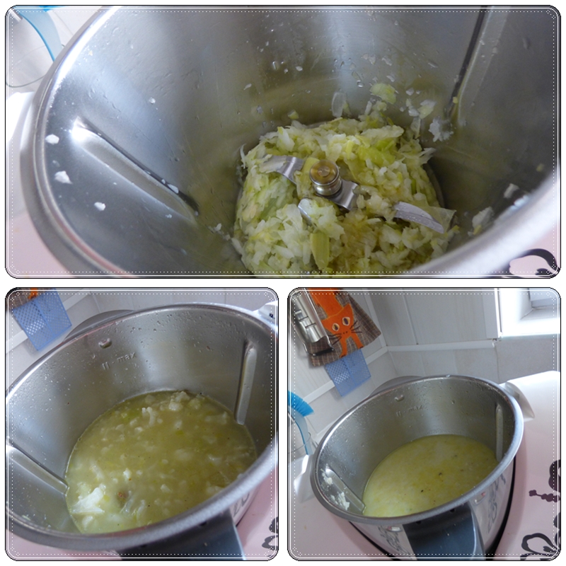 Avec le quart restant de mon chou chinois, j'ai préparé un excellente potage aux mille saveurs! Les ingrédients : - 1/4 de chou chinois coupé en lamelles - 1 carotte coupée en rondelles - 1 pomme de terre coupée en petits morceaux - 2 bouillons thaï - 1 oignon - 10g d'huile d'olive - sel et poivre du moulin La recette : 1 - Eplucher l'oignon, le couper en 4 et le mixer 5 secondes, vitesse 5. 2 - A l'arrêt de la minuterie, racler les bords. Ajouter l'huile d'olive et programmer 5 minutes, vitesse 1. 3 - Ajouter 700g d'eau, les rondelles de carotte, les dés de pomme de terre et les 2 bouillons thaï. Programmer 10 minutes, 100°, vitesse 1. 4 - A l'arrêt de la minuterie, ajouter les lamelles de chou chinois et cuire 15 minutes, mijotage, 100°, sens inverse. 5 - Servir et déguster. |